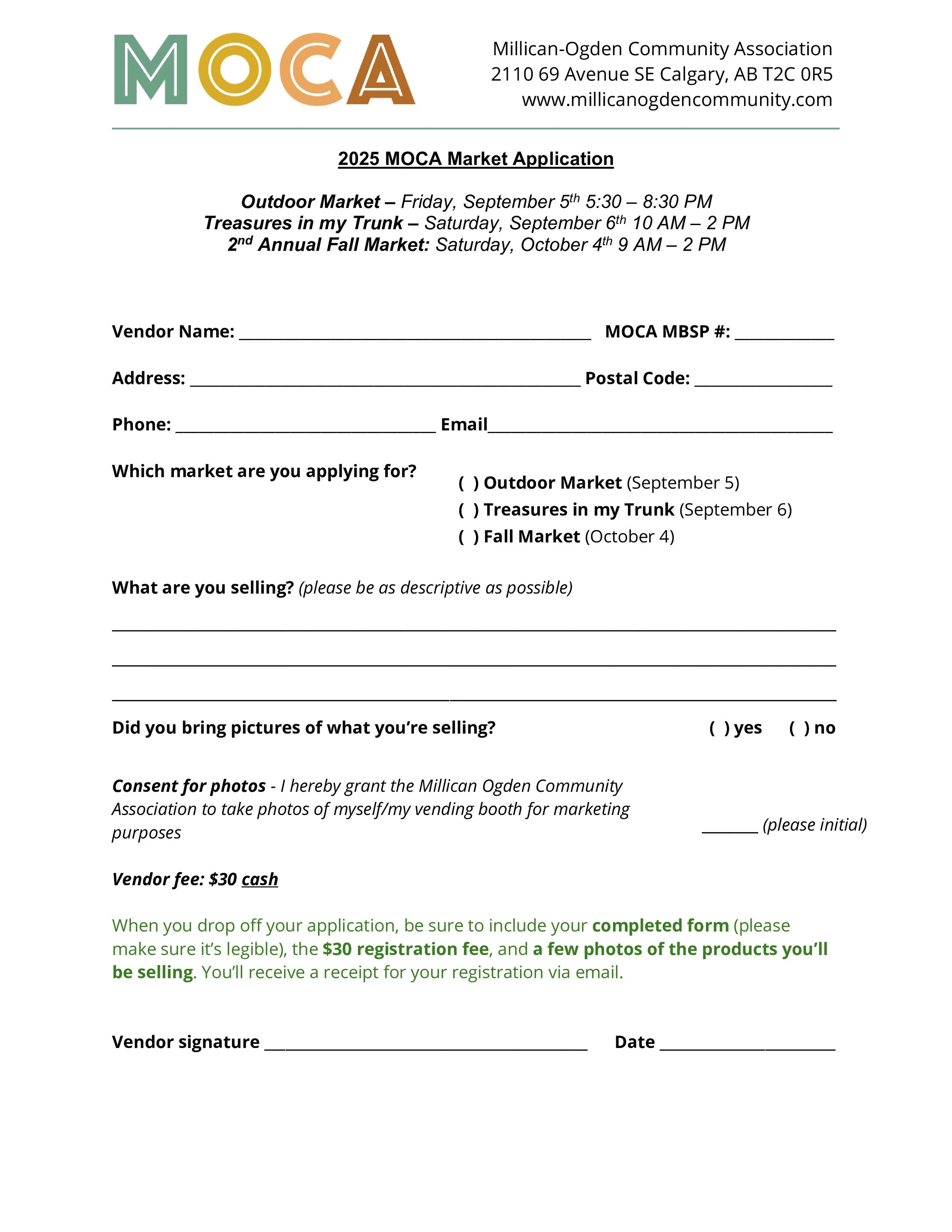 Please bring your MOCA membership (if applicable), valid photo ID, and photos of what you’re selling. Registration must be completed by the vendor who will be participating in the market.